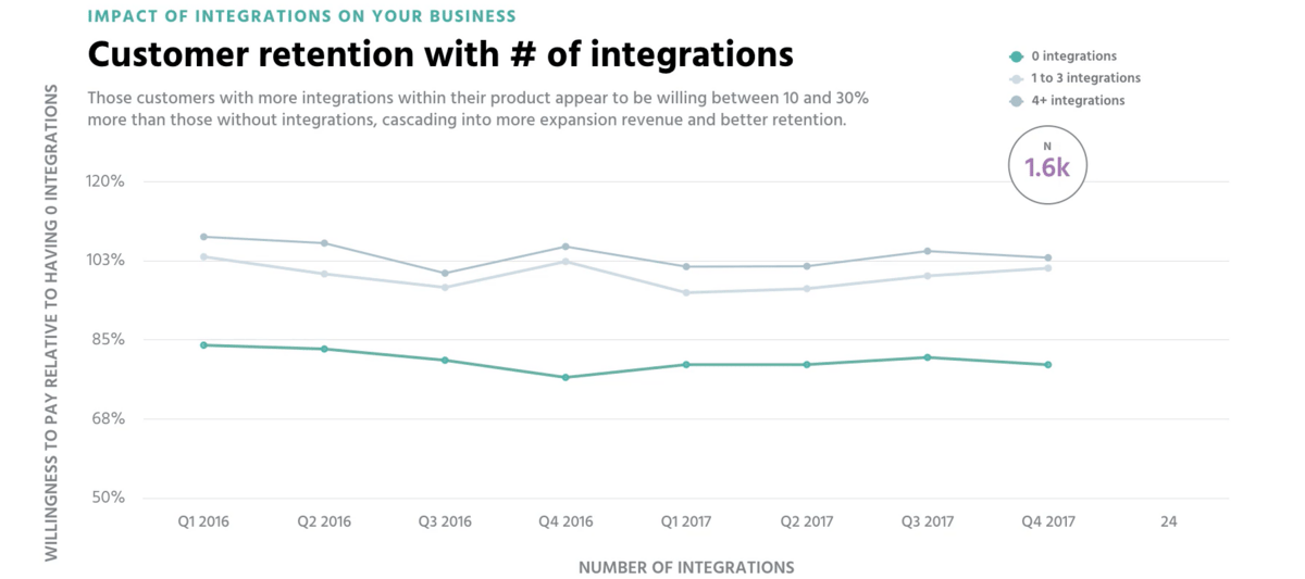 Willingness to pay is 20% higher for products with 5-10 integrations, and 30%+ for products with 11+ integrations