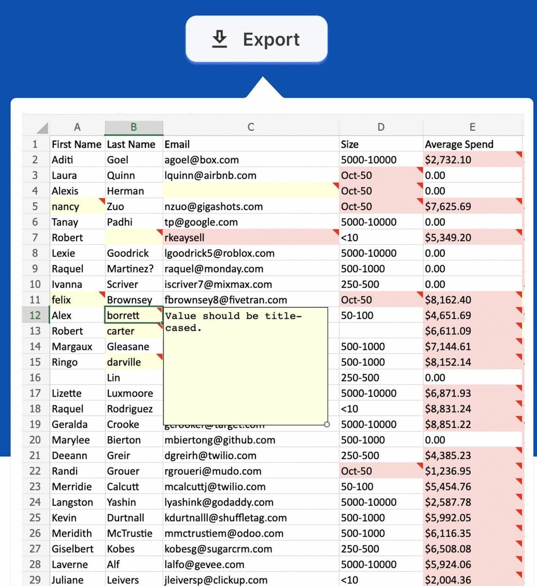 Error handling: After error detection comes error fixing. Some errors are easy to fix, like capitalization. Some are more difficult, like interpolating missing values - should you use mean, median, mode, percentiles? The user experience is important as well. OneSchema can apply hot fixes in bulk and navigate & filter errors. Sometimes, select data points just don't make sense and the end user needs to corroborate with colleagues for troubleshooting. OneSchema has a neat quality-of-life feature that allows exporting the data to an Excel file with errors highlighted and annotated. In large data files, this is a life saver. Imagine having to annotate hundreds to thousands of cells.