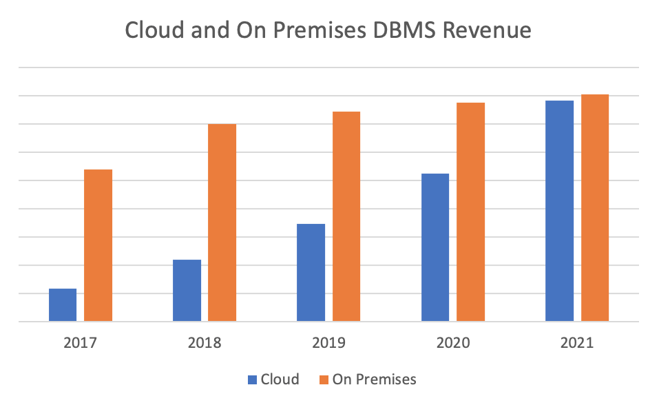 The shift of data to the cloud is massive. Gartner estimates that the database management system is $80 billion with the cloud segment contributing ~50% or $39.2 billion. The market grew by $14.5 billion (22.3%) in 2021 and 90% of the growth came from the cloud.
