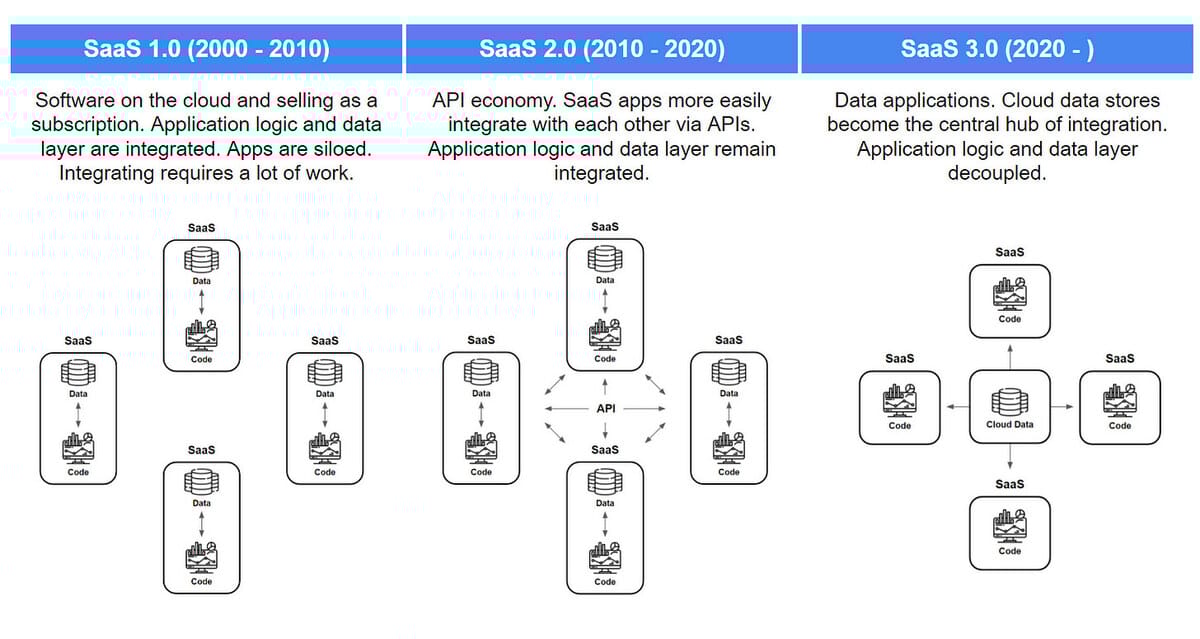 This makes sense from a macro-efficiency standpoint. For n SaaS apps in the world, (n-1)!! - double factorial - integrations are needed to connect all apps in the SaaS 2.0 world. And n x m integrations in the SaaS 3.0 world, where m is the number of data platforms.