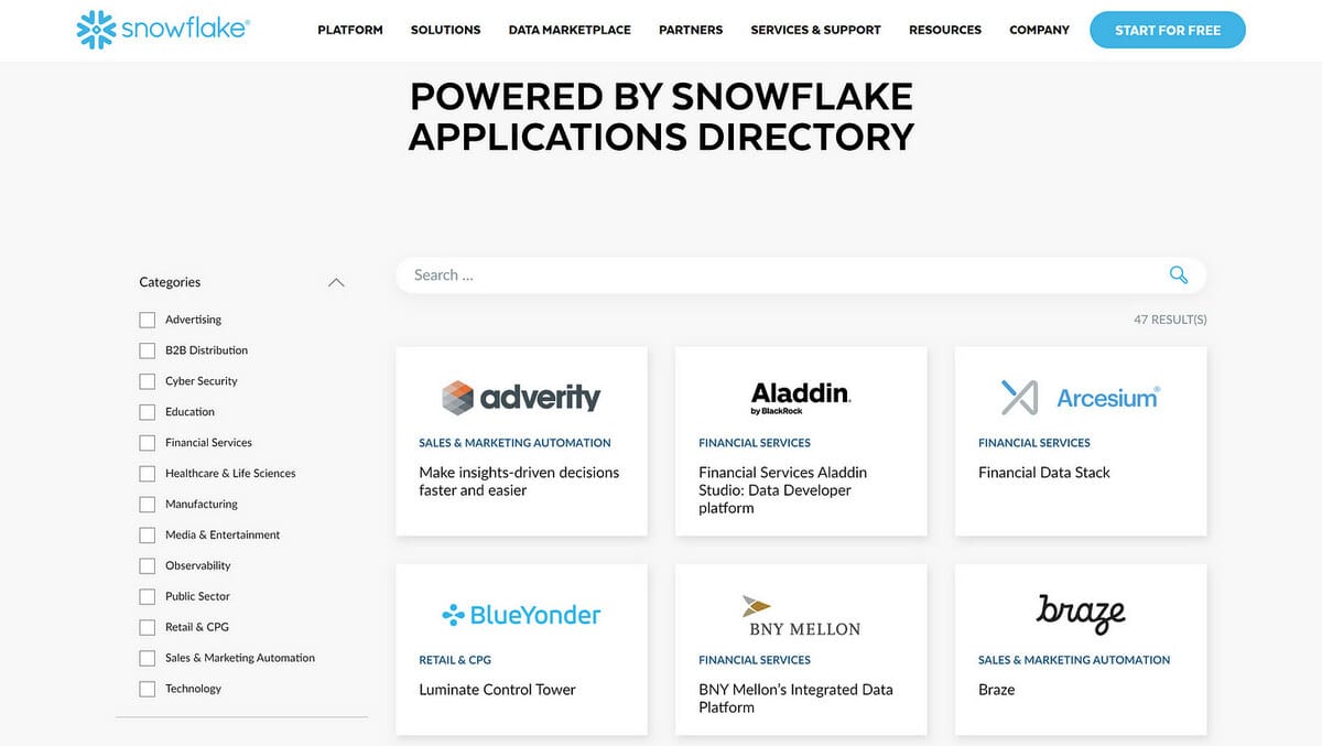 In June 2021, Snowflake launched a program called “Powered by Snowflake” with five founding participants selling applications built on top of Snowflake. This excludes technology partners in adjacent data engineering spaces like data catalogs. The program gives companies dedicated support and co-marketing opportunities to build and sell data products using Snowflake. The list has grown >9x in less than a year to 47 today with use cases from education to manufacturing. This understates the scale because there are a lot of companies that directly integrate with Snowflake, like Kubit which provides product analytics for the modern data stack, but are not part of the program.