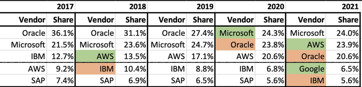 You can see the momentum of cloud players not only from the chart above but also from the shift in market leaders. Microsoft Azure, Amazon Web Services, and Google Cloud Platform (the cloud trinity) overtook Oracle, IBM, and SAP.