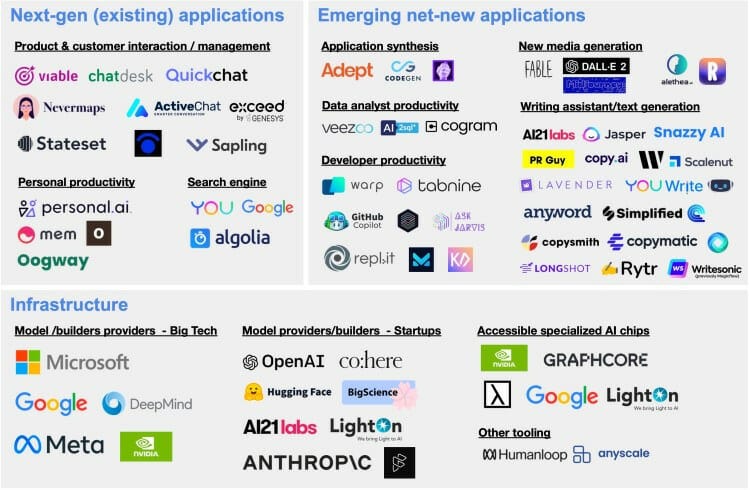 Anticipate second-order effects: As applications built on foundation models grow, infrastructure, risk mitigation, and security needs will too. We’re still in the early phases of tackling questions like how to retrain models with new data efficiently, how to distinguish between machine versus human generated content, and what risk mitigation tools and processes will be needed.
