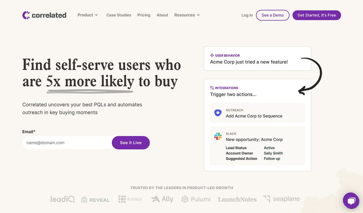 Correlated's Product Led Revenue platform uses insights from the people using your product to alert your sales and revenue team and trigger next best actions, helping you exceed your expansion quota every quarter. Talk to the right person, at the right time, with the right message, so you're never blindly reaching out again.